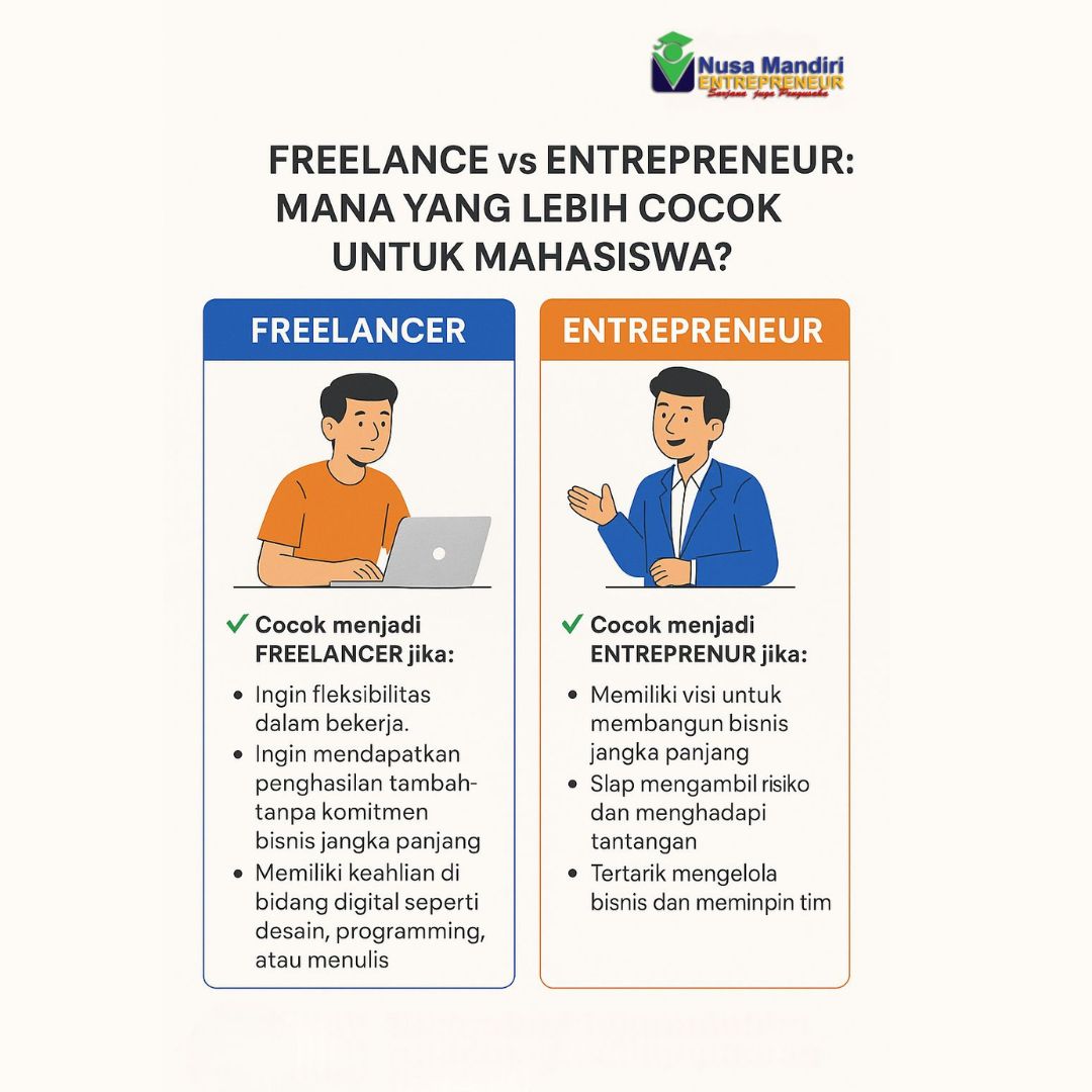 Di era digital seperti sekarang, mahasiswa memiliki banyak pilihan untuk menghasilkan pendapatan, dua di antaranya adalah menjadi Freelancer atau Entrepreneur. Keduanya memiliki kelebihan dan tantangan masing-masing, dan memilih antara keduanya tergantung pada minat, keterampilan, serta tujuan jangka panjang.