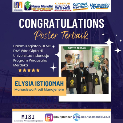 Satu lagi prestasi berhasil diraih oleh mahasiswa Universitas Nusa Mandiri (UNM). Kali ini mahasiswa UNM atas nama Elysia Istiqomah yang berasal dari Program Studi Manajemen berahasil meraih Penghargaan sebagai Poster Terbaik pada kegiatan Merdeka Belajar Kampus Merdeka (MBKM) di kampus Universitas Indonesia (UI) dengan program Wira Cipta. Wirausaha Merdeka adalah bagian dari program Kampus Merdeka Kementerian Pendidikan, Kebudayaan, Riset, dan Teknologi Indonesia yang memberikan kesempatan kepada mahasiswa belajar dan mengembangkan diri menjadi calon wirausahawan melalui aktivitas di luar kelas perkuliahan.