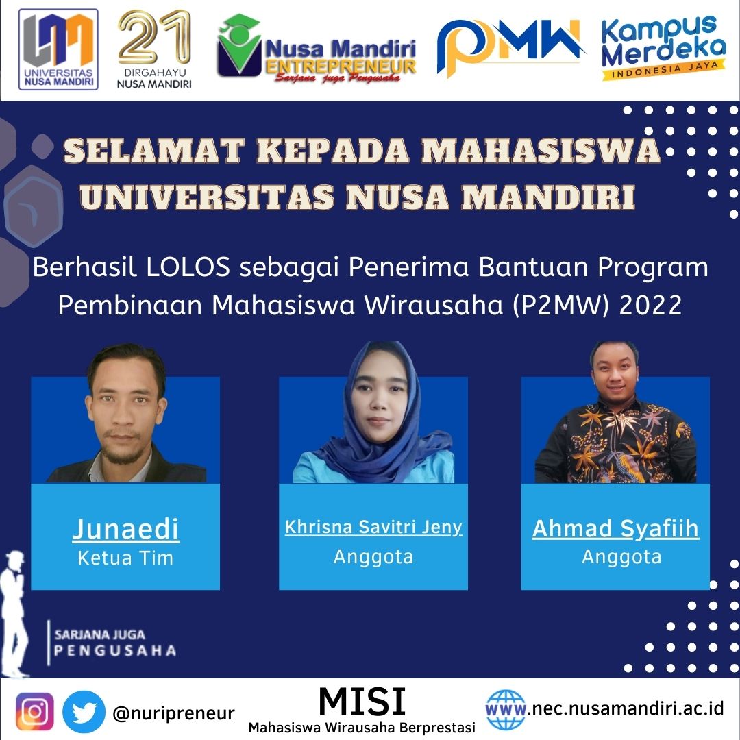 Mahasiswa Universitas Nusa Mandiri kembali mengukir prestasi. Kali ini mahasiswa Universitas Nusa Mandiri berhasil lolos sebagai penerima bantuan Program Pembinaan Mahasiswa Wirausaha (P2MW) 2022. Sekedar informasi Program Pembinaan Wirausaha Mahasiswa (P2MW) 2022 merupakan program yang dijalankan oleh Direktorat Pembelajaran dan Kemahasiswaan, Ditjen Diktiristek. Program ini bertujuan untuk mendorong dan mencetak mahasiswa untuk menjalankan dan mengembangkan wirausaha serta meningkatkan program kewirausahaan di perguruan tinggi.
