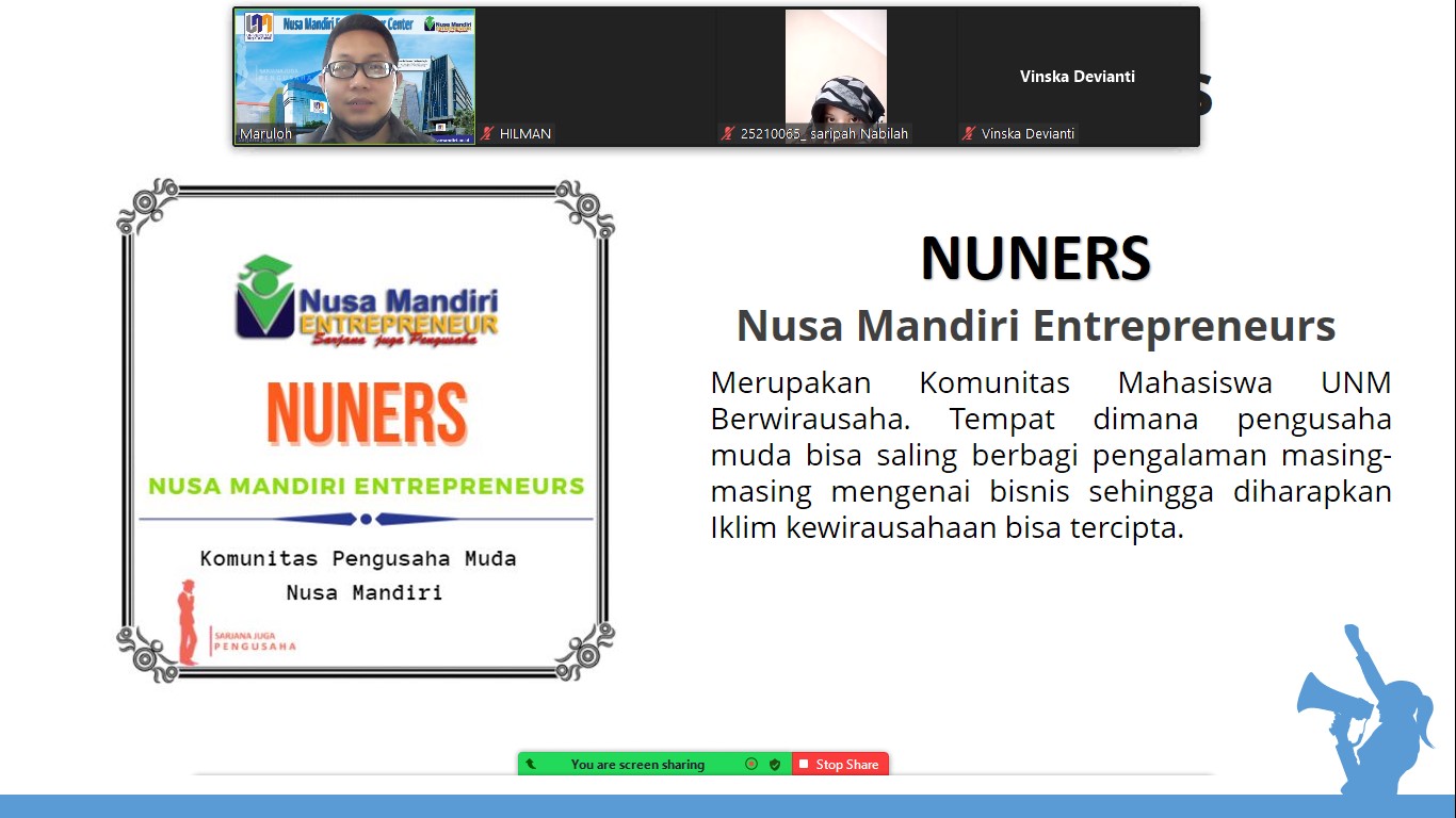 Nusa Mandiri Entrepreneur Center Menggelar acara Kopdar Bisnis bersama Komunitas Wirausaha Nusa Mandiri. Pengusaha fashio hingga yang aktif Startup Digital hadir memeriahkah acara Kopdar dan Sharing Session Komunitas Nusa Mandiri Entrepreneurs (NUNERS)