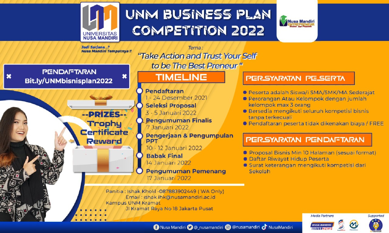 Universitas Nusa Mandiri mengadakan Lomba Bussiness Plan Competition 2022 dengan tema “Take Action n Trust Your Self to be Entrepreneur”. Lomba ini merupakan bagian agenda dari kegiatan Nusa Mandiri Entrepreneur Center (NEC). Dalam kegiatan sebelumnya, Mar...