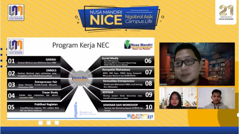 Dalam rangka memberikan bekal kepada mahasiswa Semester 1 mengenai pentingnya Entrepreneur, Universitas Nusa Mandiri bekerja sama dengan Nusa Mandiri Enterpeneur Center (NEC) mengadakan Entrepreneur Online Seminar (ENROLS) 2021. Webinar ini merupakan agenda rutin yang diadakan setiap tahun untuk ...