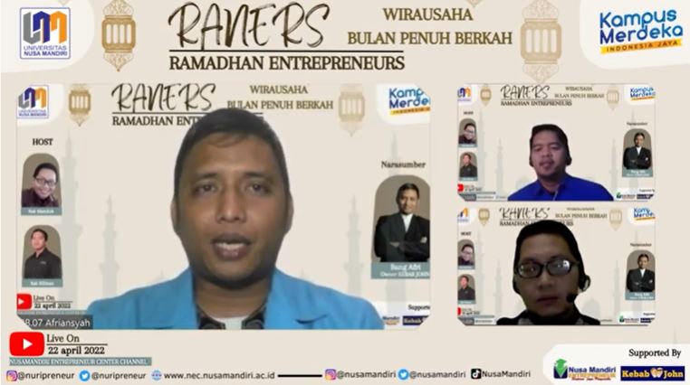 Nusa Mandiri Entrepreneur Center (NEC) mengadakan Sesi Berbagi (Sharing Session) ilmu bisnis yang diberi nama RANERS (Ramadhan Entrepreneurs) pada tanggal 22 April 2022. Kegiatan ini bertujuan untuk berbagi ilmu bisnis yang dimilki oleh mahasiswa maupun alumn...