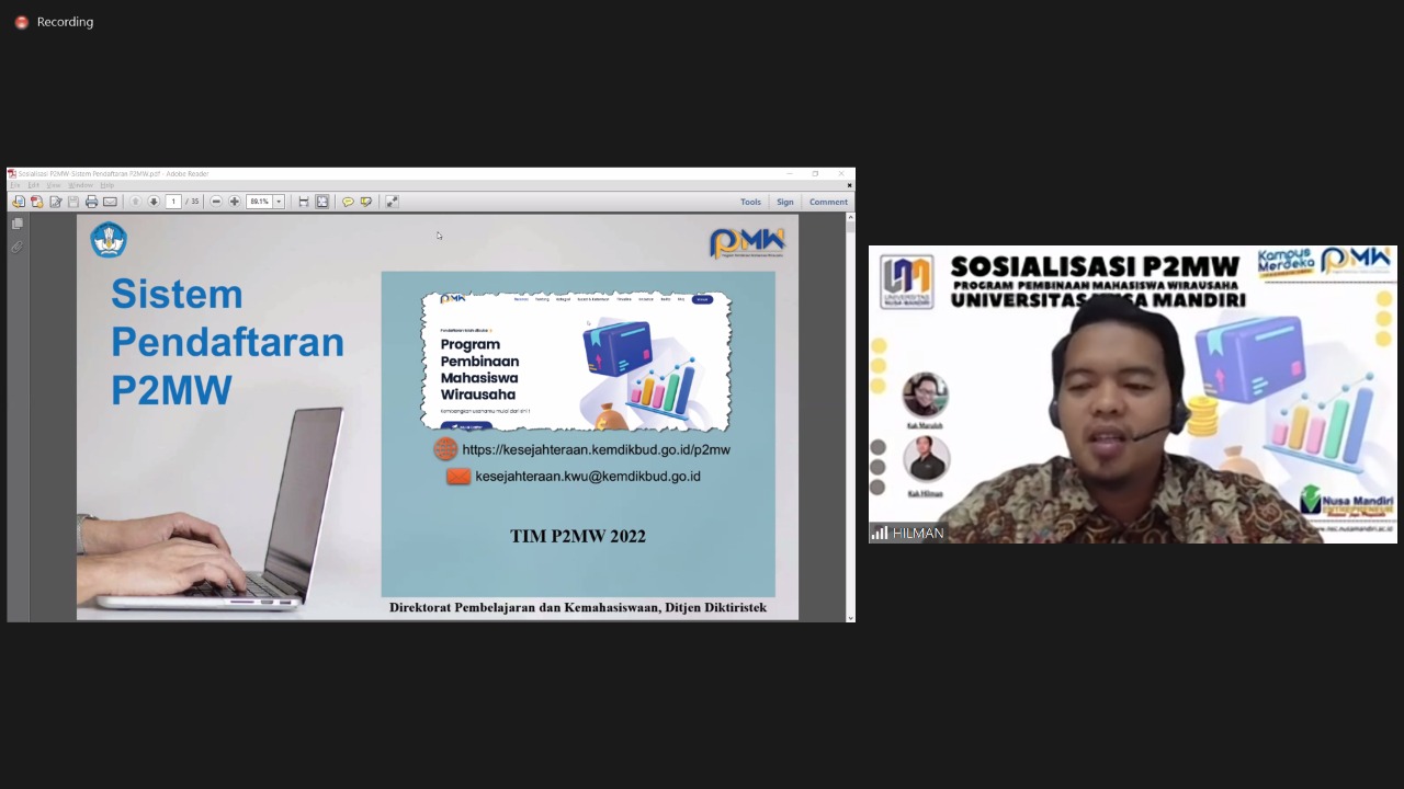 Universitas Nusa Mandiri mengadakan Sosialisasi Program Pembinaan Mahasiswa Wirausaha (P2MW) 2023 pada tanggal 28 Februari 2023 melalui zoom meeting. Kegiatan ini diselenggarakan oleh Nusa Mandiri Entrepreneur Center (NEC) dan Nusa Mandiri Start-up Center (NSC) dan di...