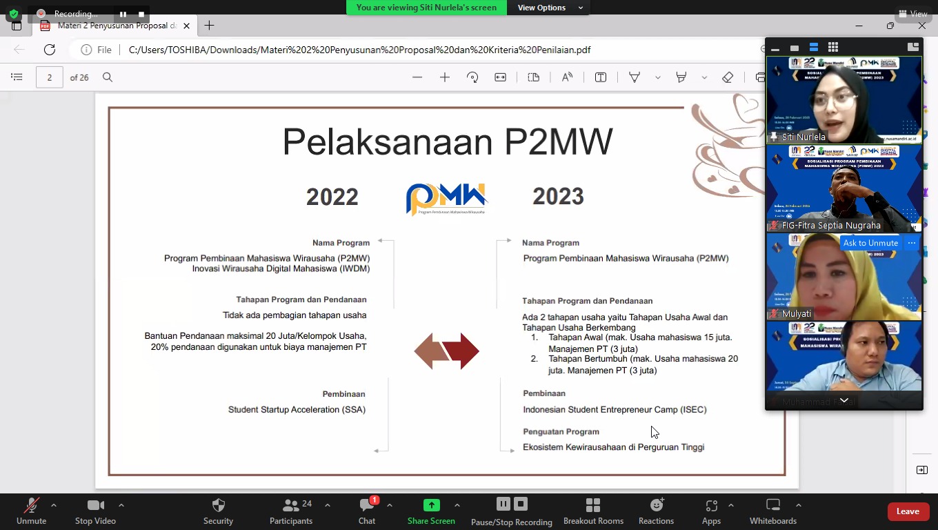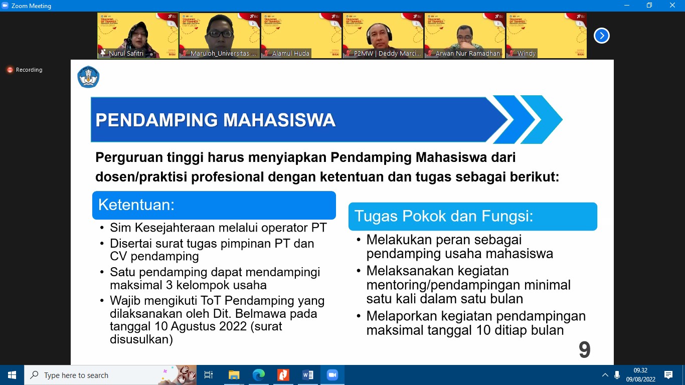 Dalam rangka pelaksanaan Program Pembinaan Mahasiswa Wirausaha (P2MW) 2022, Direktorat Pembelajaran dan Kemahasiswaan (BELMAWA) telah mengumumkan perguruan tinggi penerima bantuan dan melaksanakan bimbingan teknis pelaksanaan P2MW, sebagai tindaklanjut dari kegiatan P...