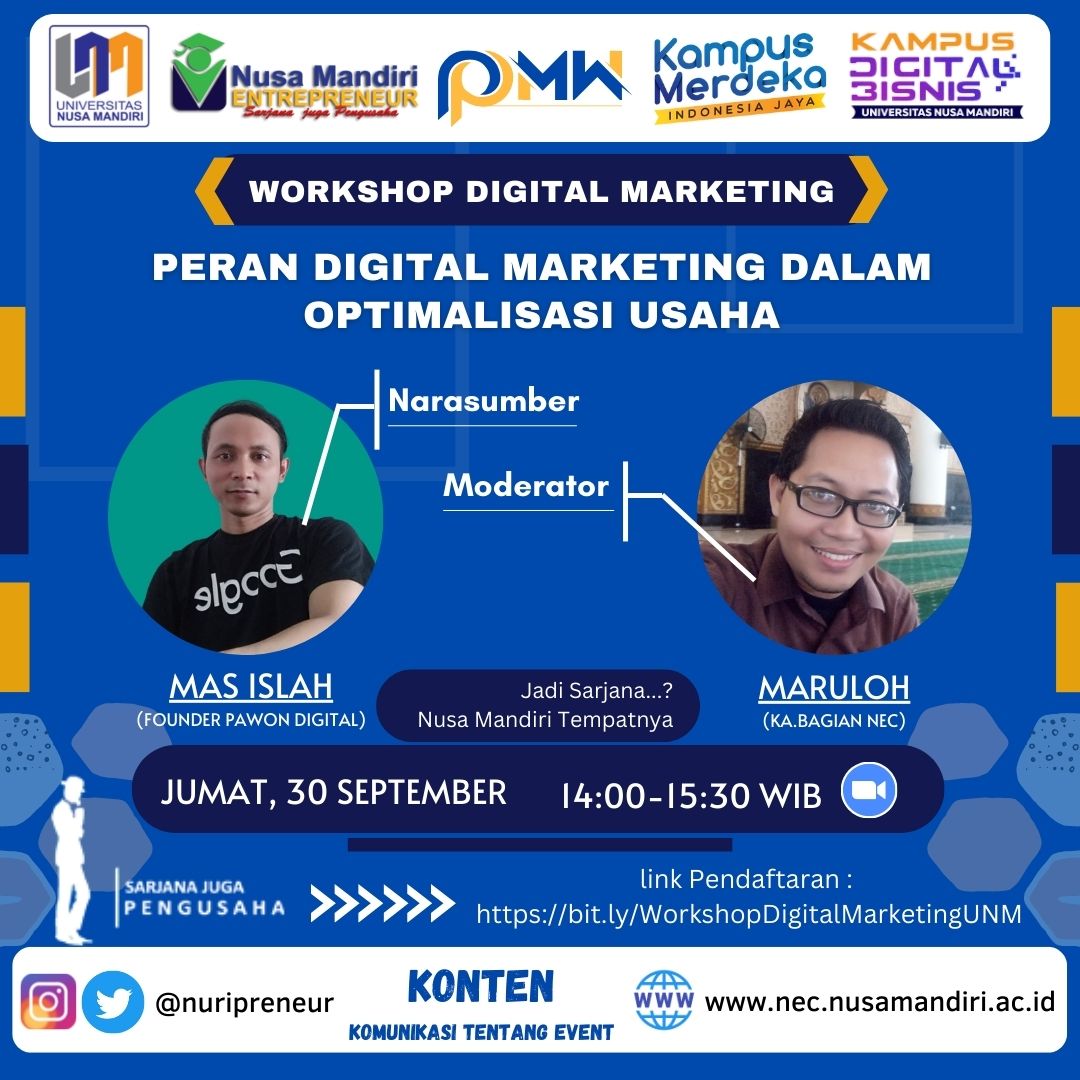 Pada tanggal 30 September 2022, Universitas Nusa Mandiri (UNM) bekerja sama dengan Nusa Mandiri Entrepreneur Center (NEC) berhasil mengadakan Workshop Digital Marketing dengan tema “Peran Digital Marketing dalam Optimalisasi Usaha”. Kegiatan workshop diadakan secara daring melalui zoo...
