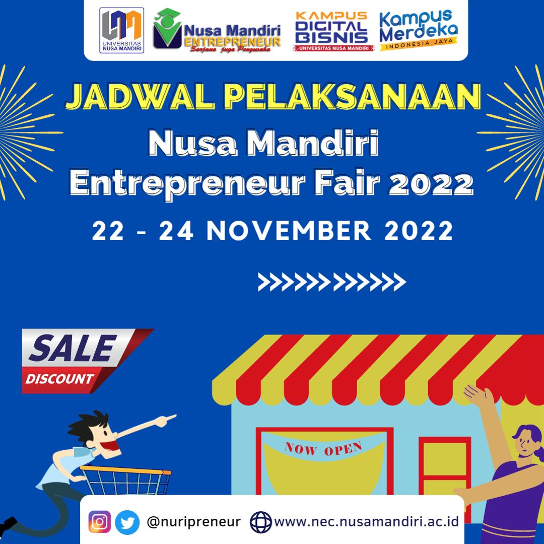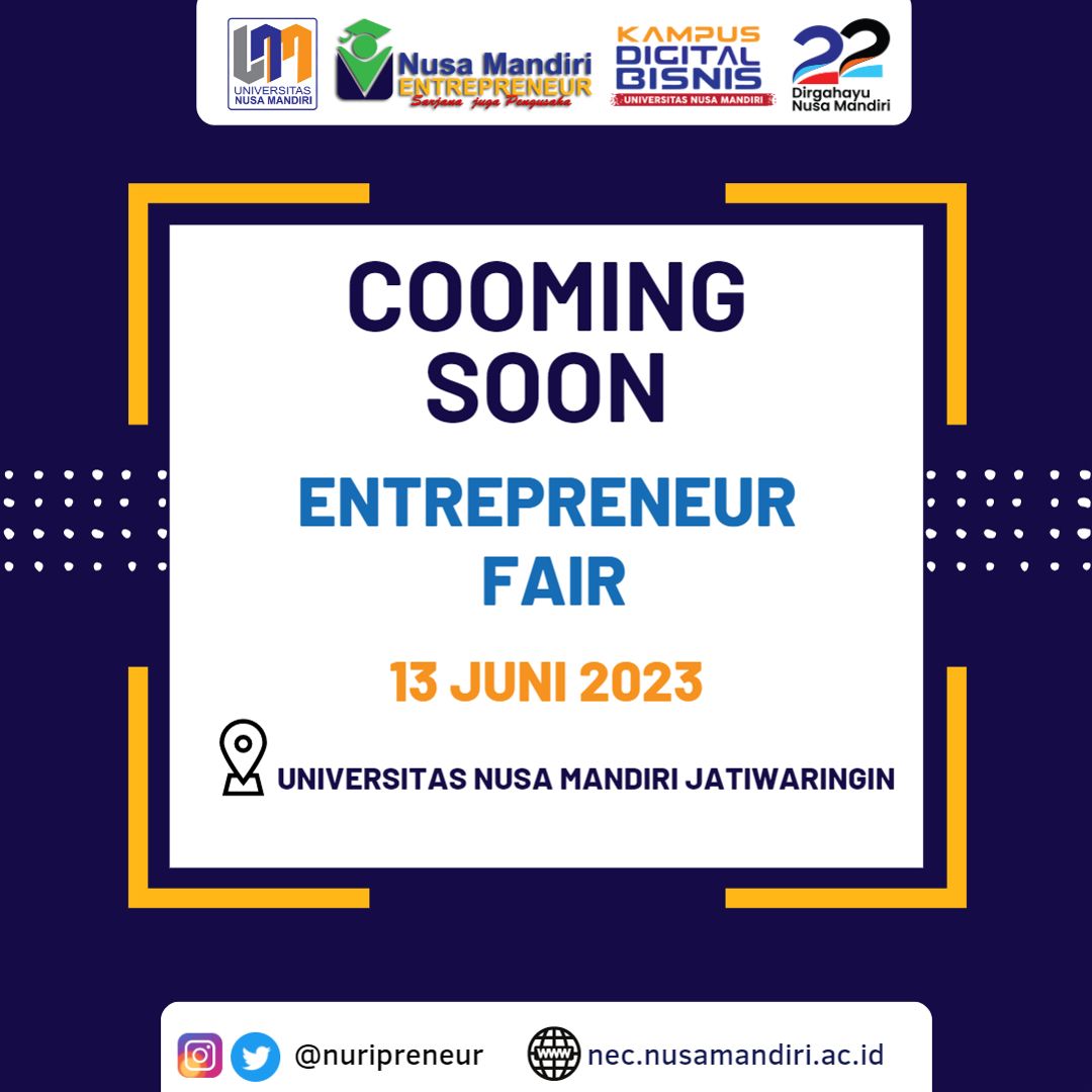 Setelah tertunda selama 2 tahun karena pandemi Covid-19, Universitas Nusa Mandiri tahun ini kembali menyelenggarakan Entrepreneurship Fair bekerja sama dengan Nusa Mandiri Entrepreneur Center (NEC). Kegiatan yang bertema "Start Now Be a Creative Entrepreneur” me...
