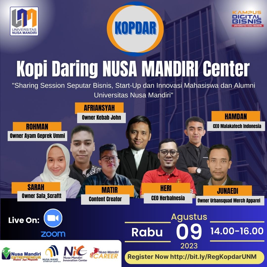 Universitas Nusa Mandiri bekerja sama dengan Nusa Mandiri Center kembali mengadakan kegiatan Kopi Daring (KOPDAR) bersama komunitas bisnis mahasiswa. Kopi Daring (KOPDAR) NURI Center merupakan acara yang dirancang khusus untuk memberikan kesempatan bagi mahasiswa dan alumni Universitas Nusa Mandi...