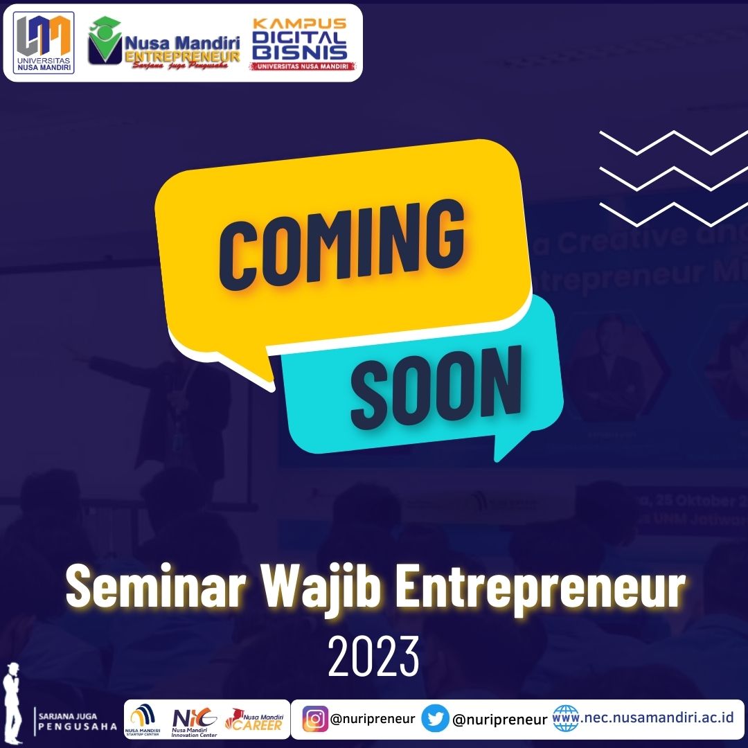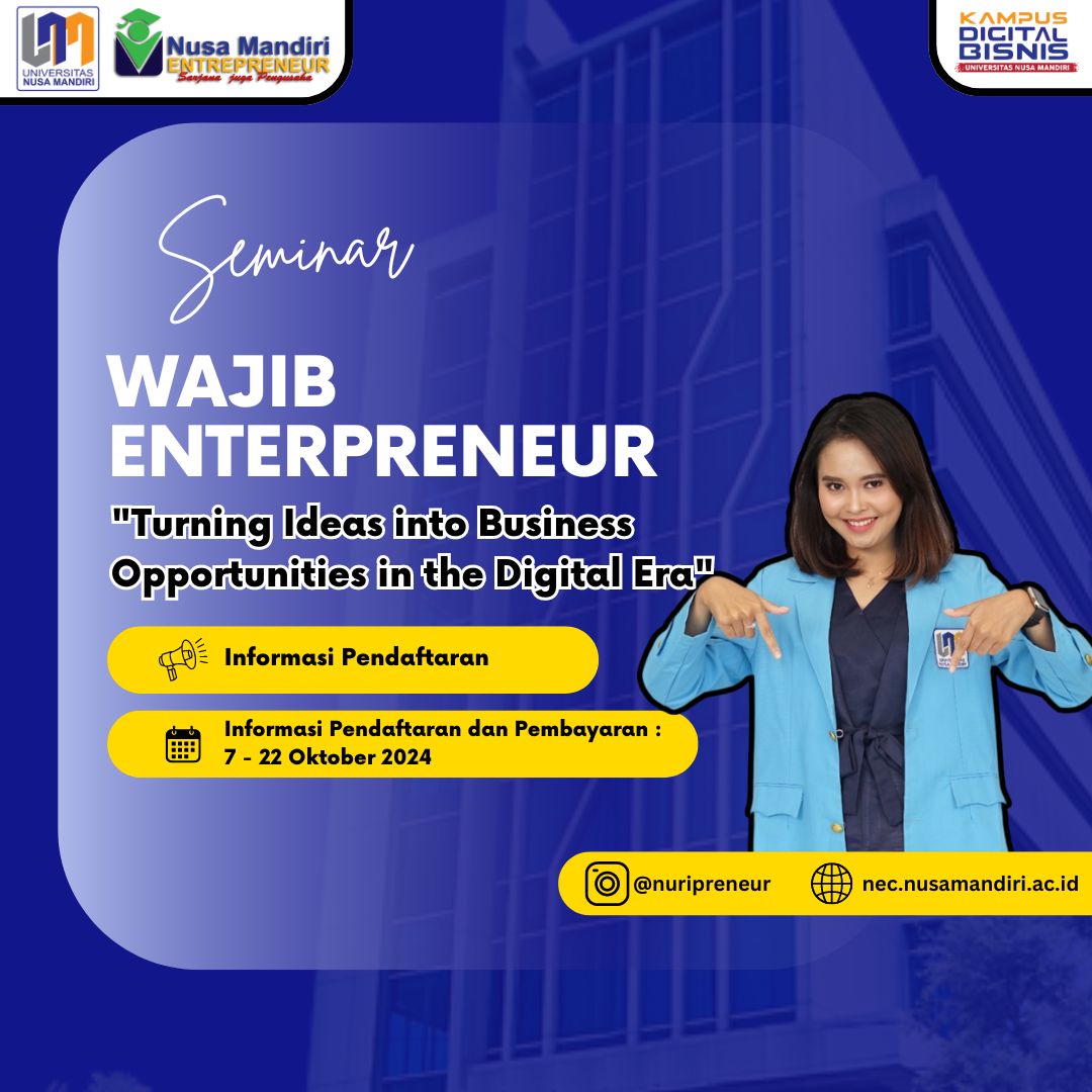 Universitas Nusa Mandiri (UNM) melalui Nusa Mandiri Entrepreneur Center (NEC) akan menggelar seminar kewirausahaan bertajuk "Turning Ideas into Business Opportunities in the Digital Era”. Seminar ini diwajibkan bagi mahasiswa yang sedang mengiku...