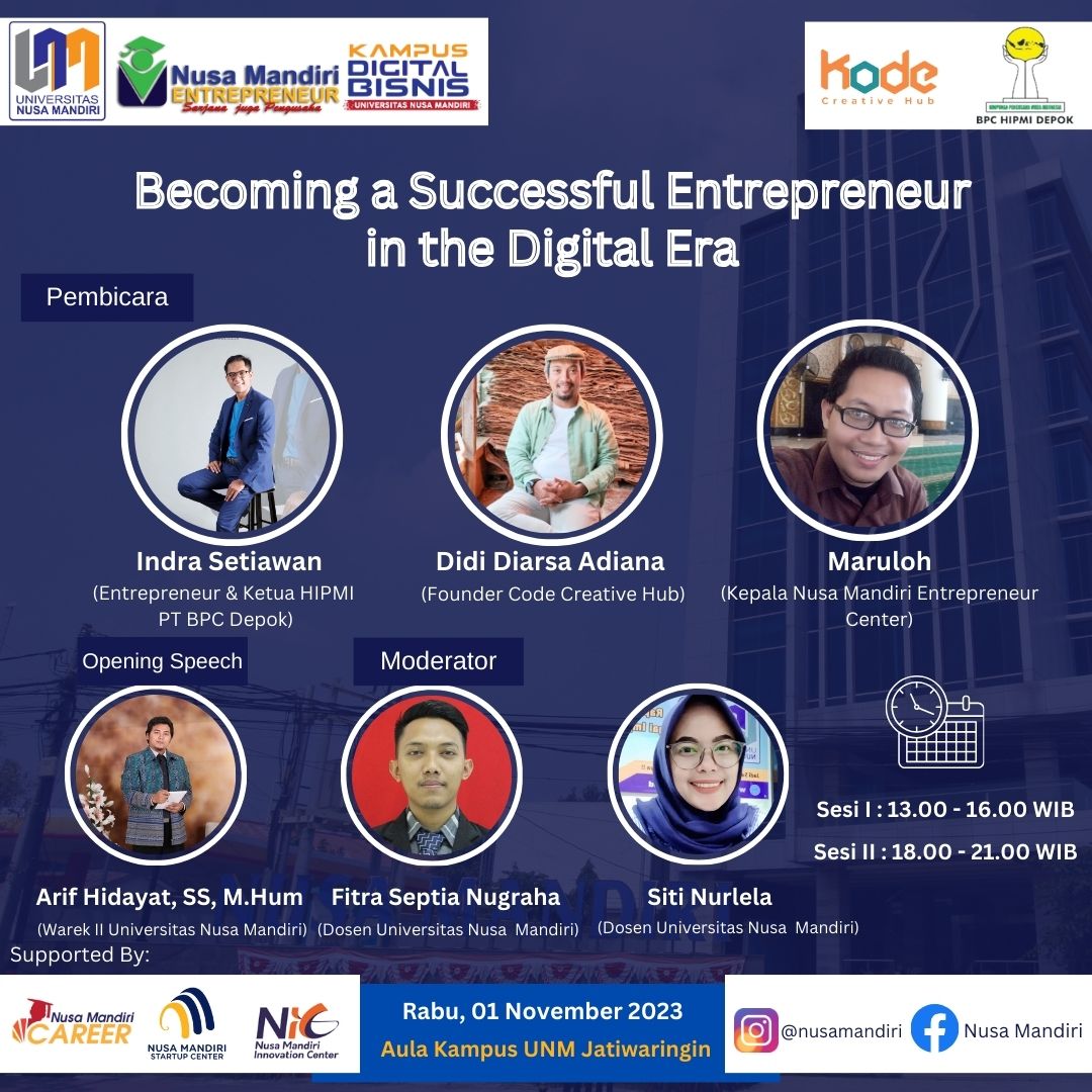 Universitas Nusa Mandiri (UNM) kembali menggelar sebuah seminar yang dirancang untuk memotivasi dan mengedukasi para mahasiswa mengenai peluang bisnis di era digital. Seminar Entrepreneur UNM 2023 yang memiliki tema "Becoming a successful entrepreneur in the digit...