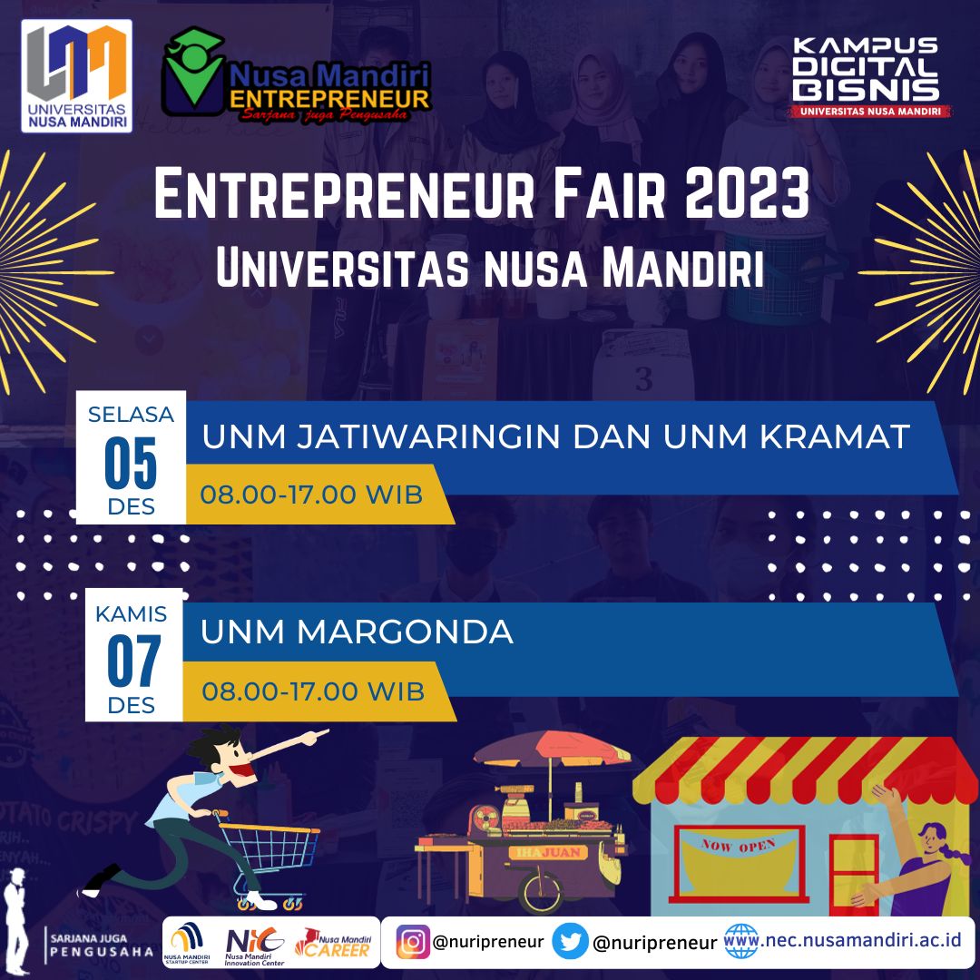 Universitas Nusa Mandiri bekerja sama dengan Nusa Mandiri Entrepreneur Center (NEC) kembali menggelar kegiatan Entrepreneur Fair 2023 dengan mengusung tema “Become a Creative and Innovative Entrepreneur”. Kegiatan Entrepreneur Fair merupakan ajang pameran bisnis mahasiswa universitas ...