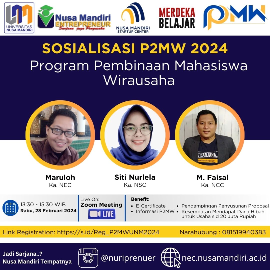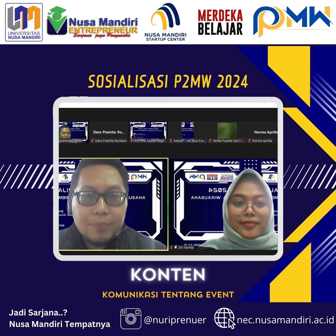 Universitas Nusa Mandiri mengadakan Sosialisasi Program Pembinaan Mahasiswa Wirausaha (P2MW) 2024 pada tanggal 29 Februari 2024 melalui zoom meeting. Kegiatan ini diselenggarakan oleh Nusa Mandiri Entrepreneur Center (NEC) dan Nusa Mandiri Start-up Center (NSC) dan di...