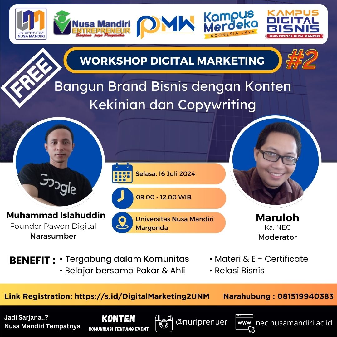 Dalam mendukung mahasiswa yang mendapat hibah pendanaan Program Pembinaan Mahasiswa Wirausaha (P2MW) 2022, Universitas Nusa Mandiri bekerja sama dengan Nusa Mandiri Entrepreneur Center (NEC) mengadakan Workshop Digital Marketing dengan mengusung tema “Bangun Bra...