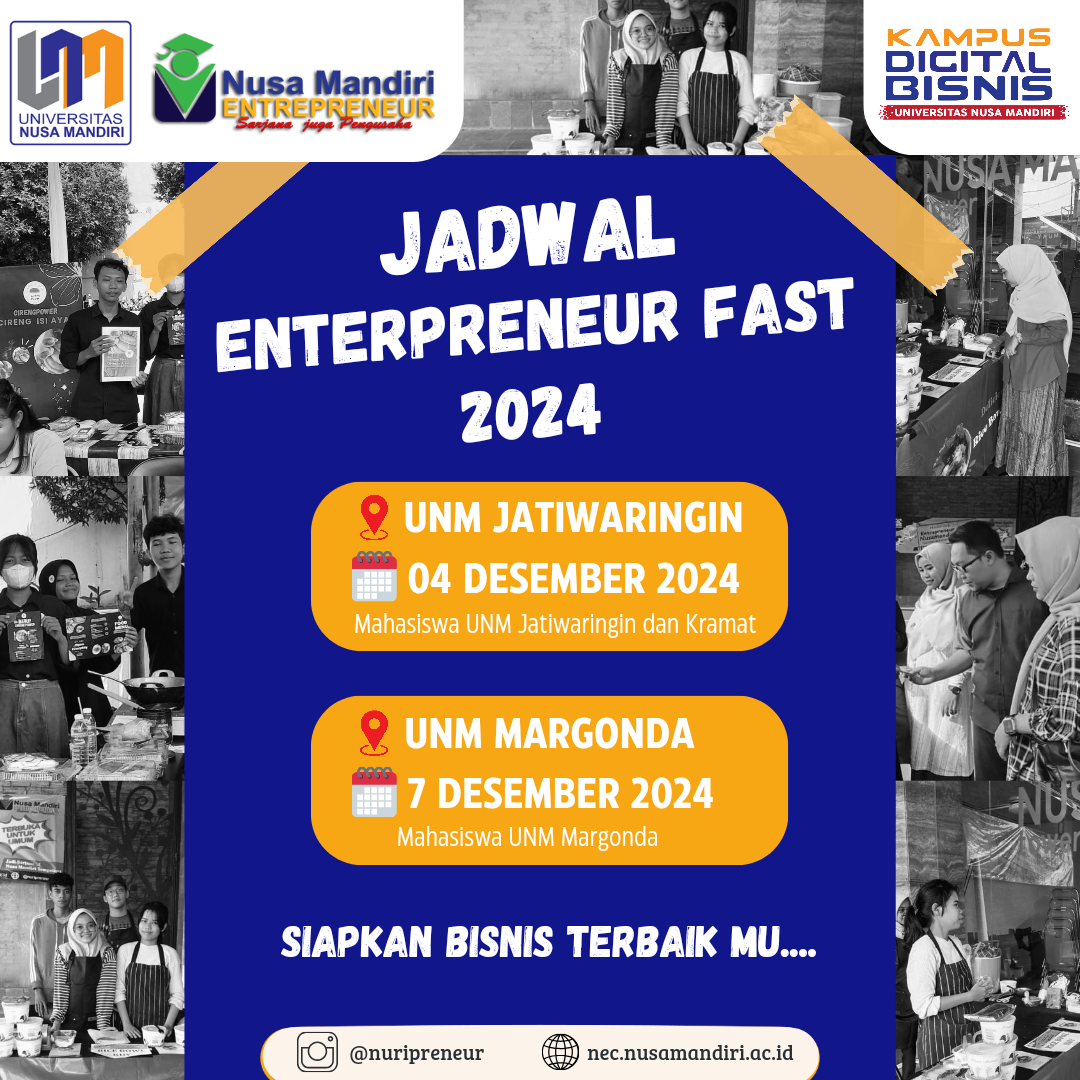 Universitas Nusa Mandiri (UNM) kembali menggelar acara tahunan Entrepreneur Fest UNM 2024 dengan tema “Turning Ideas Into Business Opportunities in the Digital Era”. Kegiatan ini akan dilaksanakan pada dua lokasi kampus, yakni di Halaman Kampus UNM Jatiwar...