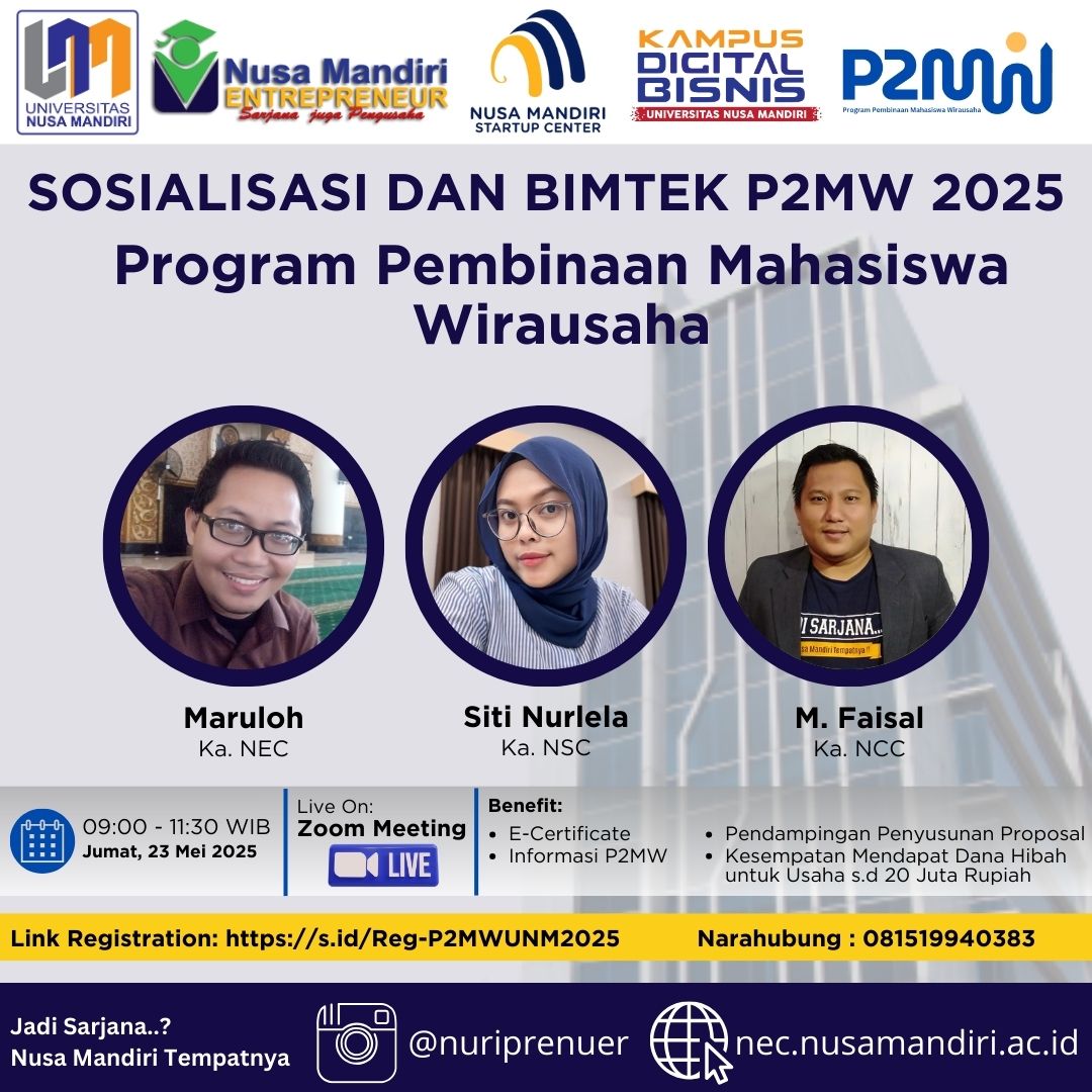 Universitas Nusa Mandiri (UNM) melalui Nusa Mandiri Entrepreneur Center (NEC) turut berpartisipasi dalam kegiatan Sosialisasi Program Pembinaan Mahasiswa Wirausaha (P2MW) Tahun 2025 yang diselenggarakan secara daring oleh Direktorat Pembelajaran dan Kemahasiswaan, ...