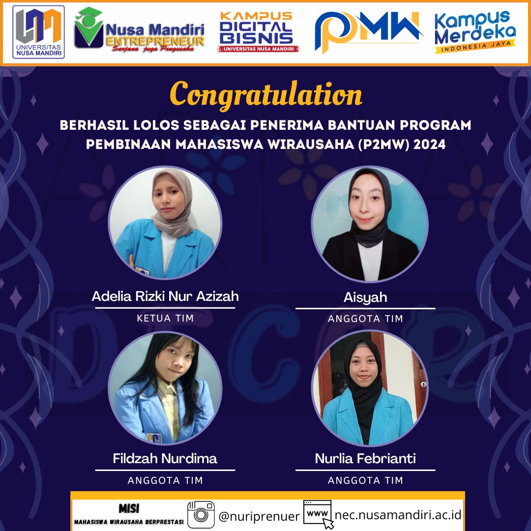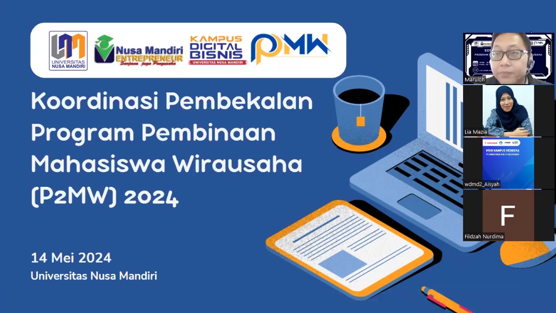 Mahasiswa Universitas Nusa Mandiri kembali mengukir prestasi dibidang kewirausahaan. Kali ini mahasiswa Universitas Nusa Mandiri berhasil lolos sebagai salah satu penerima bantuan Program Pembinaan Mahasiswa Wirausaha (P2MW) 2024. Sekedar informasi Program Pembinaan W...