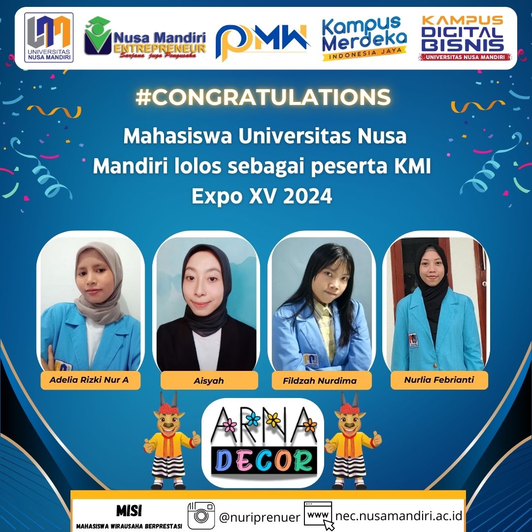 Kampus Universitas Nusa Mandiri (UNM) kembali menorehkan prestasi membanggakan. Bisnis mahasiswa UNM, Arna Decor, berhasil lolos sebagai peserta dalam KMI Expo XV 2024. Keberhasilan ini merupakan hasil dari seleksi penilaian kemajuan dari Program P2MW 2024. KMI Expo X...