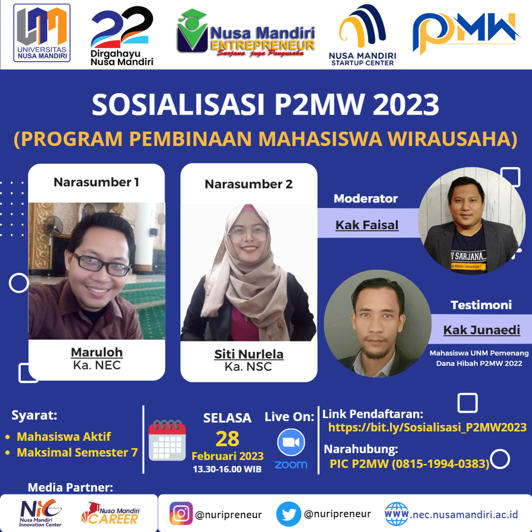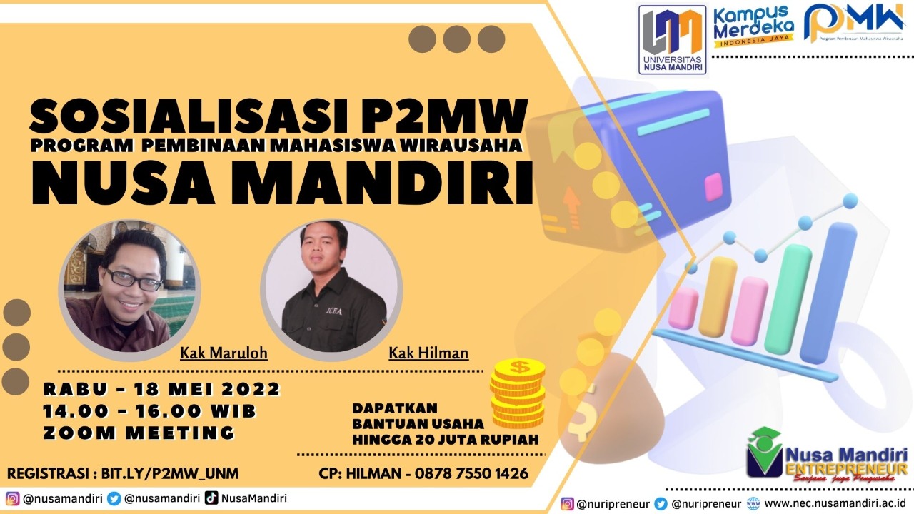 Kegiatan Sosialisasi Program Pembinaan Mahasiswa Wirausaha (P2MW) 2023 ini dilakukan untuk menjelaskan dan menginformasikan kepada mahasiswa mengenai Program yang dibuat oleh Kementrian Pendidikan, kebudayaan, Riset, dan Teknologi yaitu Program Pembinaan Mahasiswa Wir...