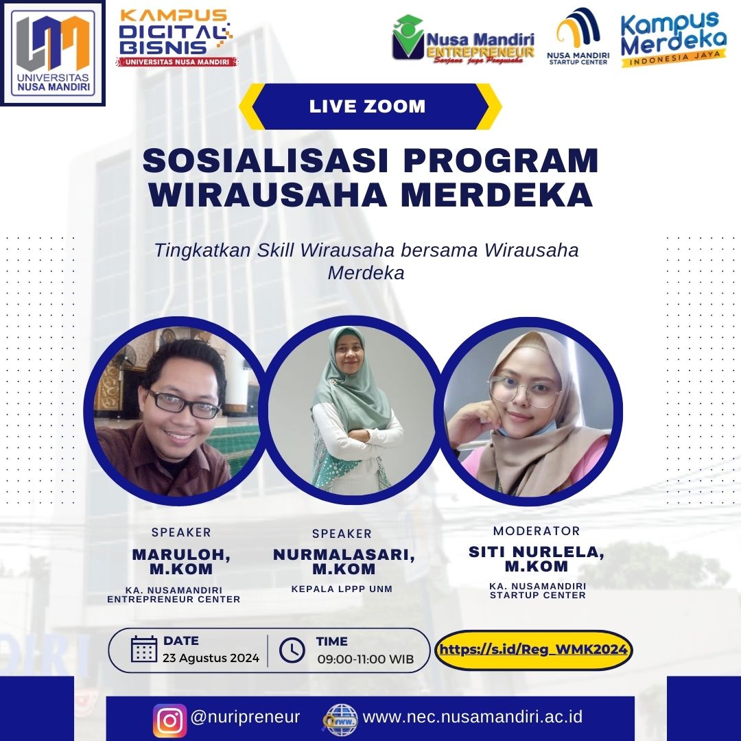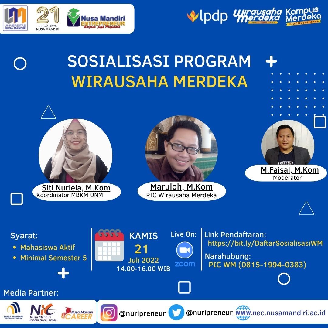 Kegiatan Sosialisasi Program Wirausaha Merdeka ini dilakukan untuk menjelaskan dan menginformasikan kepada mahasiswa mengenai Program yang dibuat oleh Kementrian Pendidikan, kebudayaan, Riset, dan Teknologi yaitu Wirausaha Merdeka (WMK)
